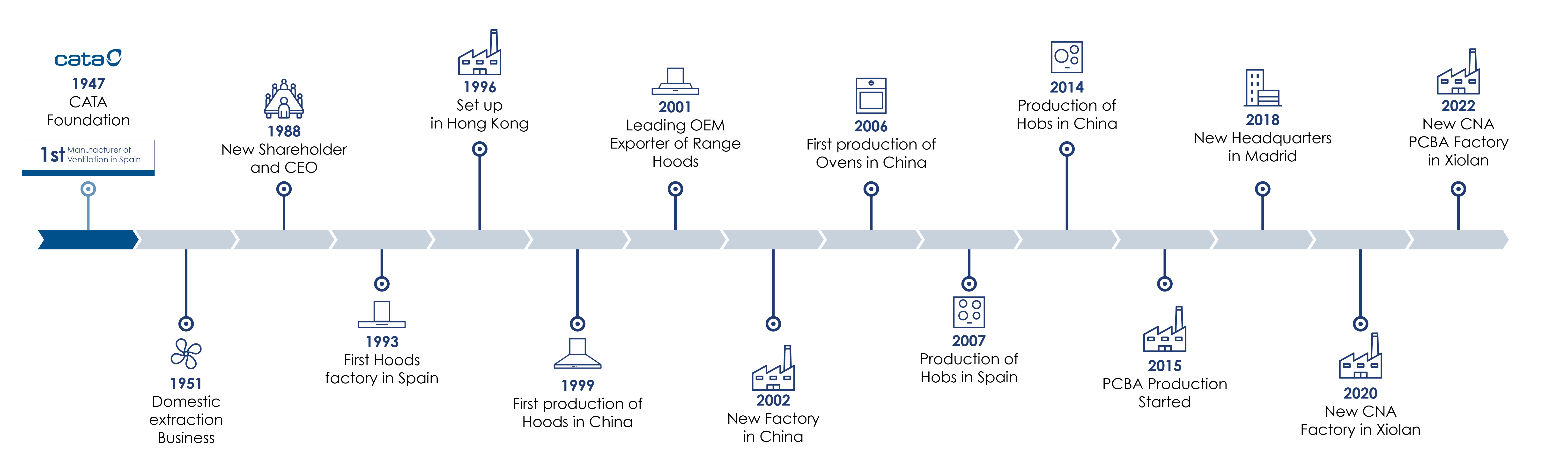 Cata Electrodomésticos marked the first chapter of a journey that would unfold into Grupo CNA. It all started in 1947, in Torelló (Spain), with a small household appliance factory that laid the foundations for a group that today encompas-ses four leading brands and several industry-related companies.